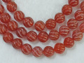 カーネリアンは和名で赤瑪瑙(あかめのう)と言います。天然の色味のマルチカラータイプと瑪瑙を人工的に加熱処理し成分を反応させて赤(赤茶色)くしたタイプとあり、こちらは人工的に加熱処理したタイプです。瑪瑙は大半が人工処理した物が主流となっており、赤瑪瑙というとこの加熱処理した物のほうがポピュラーです。加熱処理の色は染色処理の色に比べ鮮やかさは低いですが色落ちがしにくいのが特徴なので、極端に長期間紫外線に当てたりしない限りほぼ色は変わりません。斜めにねじったような彫刻がしてあります。