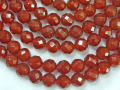 カーネリアンは和名で赤瑪瑙(あかめのう)と言います。天然の色味のマルチカラータイプと瑪瑙を人工的に加熱処理し成分を反応させて赤(赤茶色)くしたタイプとあり、こちらは人工的に加熱処理したタイプです。瑪瑙は大半が人工処理した物が主流となっており、赤瑪瑙というとこの加熱処理した物のほうがポピュラーです。加熱処理の色は染色処理の色に比べ鮮やかさは低いですが色落ちがしにくいのが特徴なので、極端に長期間紫外線に当てたりしない限りほぼ色は変わりません。球体を約48面にカットして仕上げたビーズです。