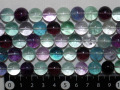 フローライトは色のバリエーションが豊富で、緑・白・青・紫・黄などが入り混じったり、縞模様になったりしたものがあります。紫外線に当てた時の輝きが蛍の光のようであることから、和名で「蛍石」といいます。硬度が低くて傷つきやすく、紫外線や強い熱にも弱く、衝撃を与えると割れてしまうことがありますから、扱いには注意してくさい。