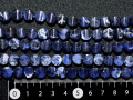 濃い青~薄い青~白が斑文状になった半透明から不透明のガラス光沢を持つ石です。成分はソーダ(ナトリウム)と白いカルサイトを含むため、ソーダライトと名付けられました。水や紫外線には比較的強いです。四角いホウズキのようなイメージの形です。